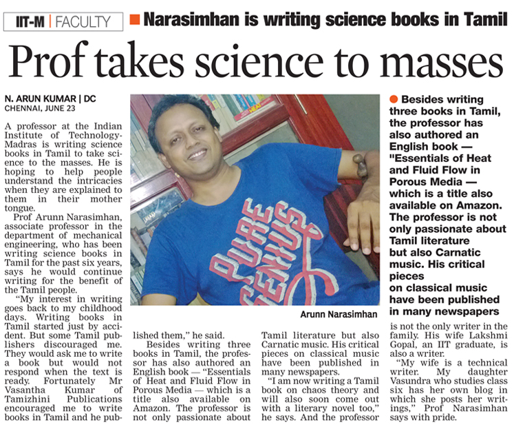 Here is a list of my current research publications and their topic-wise segregation. I also write extensively in Tamil – my mother-tongue – on Science, Carnatic Music and Literature. The Books page provide links and details for my published Tamil novels (creative fiction) and popular science books. Recently: 2024: Who’s a Good Fiction Reader? — Video of my public lecture in Tamil. 2023: Textbook — Essentials of Heat and Fluid Flow in Porous Media 2020: The Write Thoughts Talk Video — My Kenyon-IITM Writer’s Workshop Talk. |
