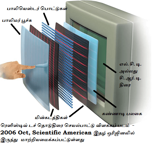 ரெஸிஸ்டிவ் டச் தான் ஆதியில் (1977இல் என்று நினைக்கிறேன்) தோன்றியது. விலை கம்மி. ரஃப் அண்ட் டஃப். தொடுகிறேன் பேர்வழி என்று அதன்மீது முழங்கையால் தோசைவார்த்தாலும் திரை செயல்படும். ஆனால் ஆறேழு லேயர்கள் கொண்டதால், திரைக்குபின் இருப்பவை (எழுத்து, எக்ஸெட்ரா) சற்று மங்கலாகத்தான் தெரியும்.