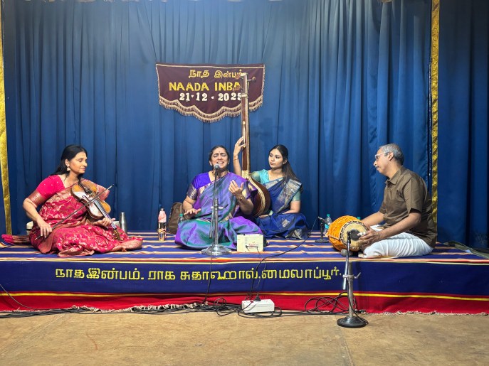 Sumitra Vasudev gave a concert at Raga Sudha hall for Nada Inbam on 21st Dec, 2025 at 6:15 PM, accompanied on the violin by Padma Shankar and on the mridangam by Arun Prakash.